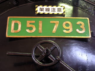 | 東北・東海道・中央・北陸と主に東日本の各地で活躍したD51 793。 | ナンバープレートは緑色。保存車両は赤に塗られていることが多いのですが。 | ||