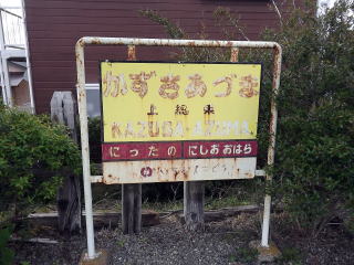 | いすみ線 上総東駅 かなり古くなった、おそらくオリジナル様式。元の色が判然としませんが、隣駅表示にラインが入り、最下部に社章と、おそらく社名が入っています。(H25.5撮影) |