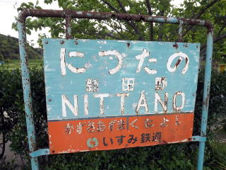 いすみ線 新田野駅 左のものと同じか、色違いのもの。モスグリーンベースに隣駅表示以下はオレンジ。下部に社章と社名が入るもの。この訪問後に新様式に更新されているようです。(H25.5撮影) |