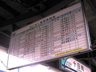 | ほくほく線 十日町駅 天吊式の時刻表。赤字が特急列車ですが中間唯一の特急停車駅なので、ここまで大型のものは他駅にはありません。(H17.4撮影) |