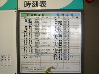 ほくほく線 六日町駅 JR同一構内ですが北越急行専用ホームの時刻表。一部特急も停車しますが、JRホームに停まるためここには表記はありません。(H16.7撮影) |