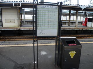 | 宗谷本線 名寄駅 標準的にコーポレートカラーの黄緑ラインの時刻表です。乗換案内を流用したもの。中規模駅ではこのような自立式のものが多いようです。(H20.11撮影) |