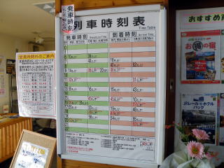 | 日高本線 様似駅 黄緑色のストライプが水色となっている駅もあります。宗谷本線の小駅でも見られました。下の上は線内時刻表です。(H26.1撮影) |
