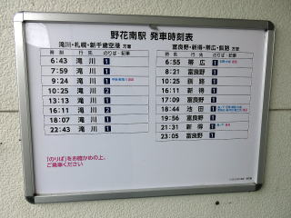 根室本線 野花南駅 駅舎にあった時刻表。特にストライプはなくシンプルな様式です。左のものより新しく更新されたものかもしれません。(H28.4撮影) |
