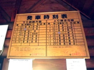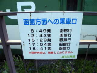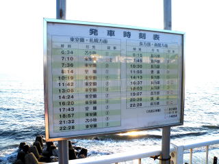 函館本線 流山温泉駅 ホームの、乗車位置にあった時刻表。乗車位置案内板を兼ねています。これは上り方面乗り場で、上り方面の発車時刻が記されています。(H21.9撮影) |