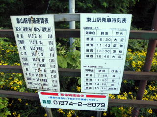 | 函館本線 東山駅 ホームの時刻表。一部普通列車の通過もある最小設備の駅の駅で、諸々の掲示をまとめてありました。(H21.8撮影) |