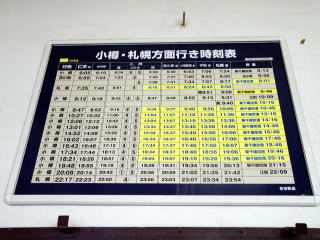 函館本線 仁木駅 自駅のほか、行き先主要駅の着時刻(駅によっては発時刻も)が載ったタイプ。改札上でしたがこれは目線位置にあった方がよいように思います。(H21.8撮影) |