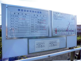 根室本線 東根室駅 最東端駅、東根室駅の時刻表。やはり最小設備の駅で、ホーム上の大きな掲示板に掲示をまとめていました。(H21.9撮影) |