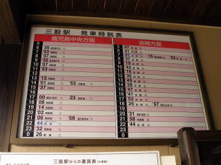 日豊本線 三股駅 駅舎内の時刻表。上下双方向の時刻表です。左のものと同じくピンクのストライプです。(H22.5撮影) |