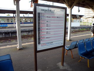 | 日豊本線 都城駅 ホームの自立式の時刻表。上り方面の時刻表で、赤文字が優等列車です。(H22.5撮影) |