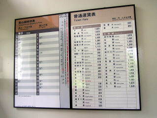 高山本線 打保駅 壁掛け式のものも自立式のものも、同じサイズの運賃表や優等列車編成表、名所案内看板などとセットになっている駅も多くあります。(H16.6撮影) |