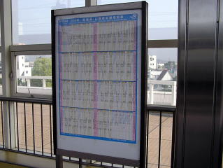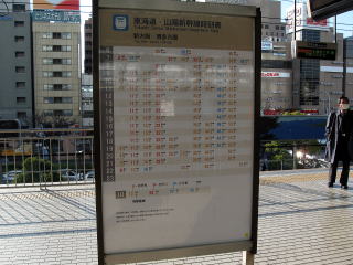東海道新幹線 新富士駅 通常の時刻表、全線の時刻表がそのまま掲示されていました。もちろんこの駅自体のものは別にあり、補助的なものです。(H17.5撮影) |