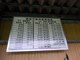 | 松浦線 西田平駅 至極標準的な時刻表。下りは全て佐世保行きですが、上りは行き先がバラつくため行き先表示があります。(H25.8撮影) |