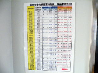 松浦線 佐世保中央駅 一番左の黄色の帯が自駅の発時刻、その右が終点佐世保駅到着時刻ですが、ごく至近のため全列車、発車の2分後が書かれています。その右は佐世保でのJR大村線・佐世保線接続列車の案内です。(H25.8撮影) |