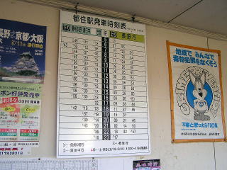 長野線 都住駅 長野線で、1方向1線以下の駅はヨコ表記で全て記載。中央の時刻軸に対し、分は内から外の順です。(H16.11撮影) |