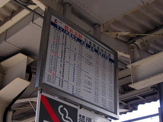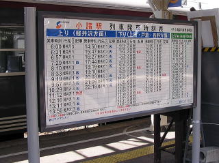 | しなの鉄道 小諸駅 JR転換駅なので、枠はJRのもの流用でしょう。乗り入れるJR小海線の時刻も隅に記載されています。備考の青字はワンマン、赤字は快速です。(H16.10撮影) |