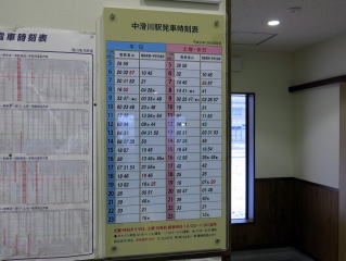 | 本線 中滑川駅 上下線、土休ダイヤ別の表記の時刻表。思えば富山地鉄は以前はこの左にある全線時刻表が各駅にあるだけだったように思います。(H27.1撮影) |