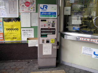 | 和歌山線 粉河駅 「JRきっぷ」の下に緑の帯で「れんらくきっぷ」の文字のある簡易券売機。線内橋本駅で接続する南海線の主要駅までのきっぷが購入できます。最下段の緑色のボタンがそれです。(H19.4撮影) |
