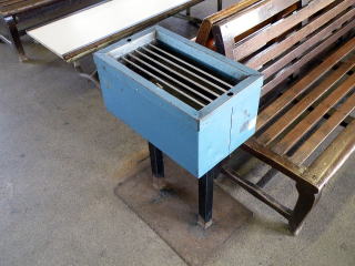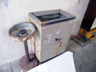 | 秋田内陸線 米内沢駅 駅舎内の喫煙所。待合所のベンチの横に大型の灰皿が置かれていました。JR東北本線北部でも見られた灰皿です。(H20.9撮影) |