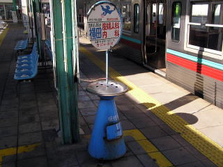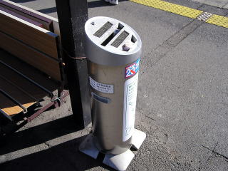 | 上毛線 中央前橋駅 ホームの喫煙コーナー。ホーム上屋下の、乗り場の端にあります。地方民鉄でよく見かける看板付きの吸いがら入れです。(H20.1撮影) |