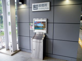 東北新幹線 いわて沼宮内駅 新幹線ホームの喫煙所。ステンレスボディの灰皿に、観光ポスターの入る、新幹線駅仕様です。(H21.7撮影) |