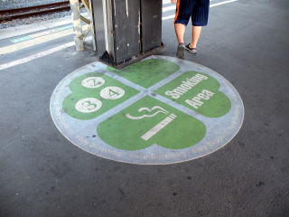 | 東北本線 郡山駅 旧タイプの灰皿が主要駅にも残っていました。喫煙所表記の、結構高い位置の看板が設置され、喫煙エリアを示す標示も四つ葉のクローバーマークのものです。ABCの意味が分かりませんが。またこの標示、近辺の標準的なものかは不明です。(H23.7撮影) |