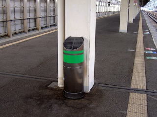 | 東北新幹線 福島駅 新幹線ホームの灰皿。かなりのホーム端にあります。コーポレートカラーのラインが入るものです。(H17.7撮影) |