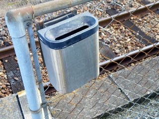 関西本線 井田川駅 やはりフェンスにかけた小さな灰皿。これはJR仕様ではなく、おそらく一般的なもの。(H16.11撮影) |