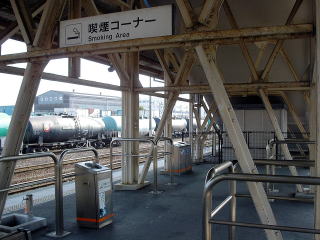 関西本線 四日市駅 少し乗り場から外れで跨線橋下に喫煙コーナーを持ってきている駅もあります。とは言え雨除けがあるのは喫煙者への配慮でしょう。(H16.11撮影) |