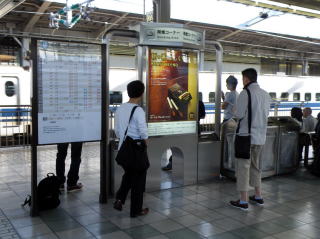 | 東海道新幹線 名古屋駅 / 新大阪駅 新幹線ホームの喫煙コーナー。中央に内照式の広告看板が入り、上部に喫煙コーナーの看板、両脇に大型の灰皿を設置しています。ホームの乗り場付近にありますが、喫煙車乗り場付近なのでしょう。(H21.1 / H21.9撮影) |