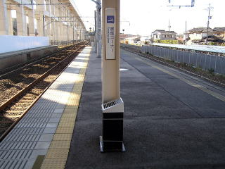 北陸本線 大聖寺駅 上屋下の、わりと乗り場に近い位置にあった喫煙所。最近ちょっと珍しいパターン。灰皿も新しいタイプです。(H17.9撮影) |