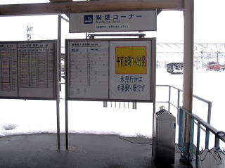 北陸本線 敦賀駅 やはり乗り場から外れた位置の灰皿。元々長編成列車が多かったところは待合所の端だったのでしょう。衝立の端の喫煙所です。(H18.2撮影) |