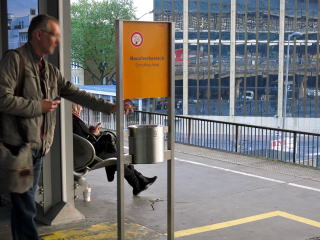 | ドイツ鉄道 ケルン中央駅 ホームの喫煙コーナー。ホームのやや隅の方でしたが、ベンチなども近くにある位置です。オープンで場所の指定がしてあります。現在は分かりませんが、感覚的に西欧は同時期の日本よりも喫煙者割合が多く、喫煙所も充実していました。そして吸いがらのポイ捨てもかなり多かったように感じました。禁煙先進地方という先入観があったためかも知れませんが…。(H27.5撮影) |