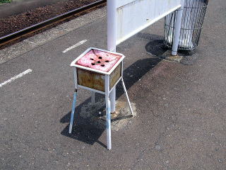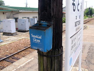 | 樽見線 北方真桑駅 ホームの喫煙所。ホーム待合所から少し離れた駅名標脇にあります。工事現場にあるような吸いがら入れです。(H16.7撮影) |