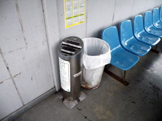 | 宿毛線 東宿毛駅 駅舎のない駅で、ホーム待合室内の喫煙コーナー。市中によくあるJTの吸いがら入れです。(H21.5撮影) |
