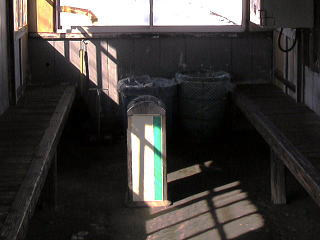| 立山線 岩峅寺駅 ホーム待合室内の喫煙所。両面ホームの、閉鎖可能な待合室ですが、ど真ん中に陣取っています。(H16.2撮影) |