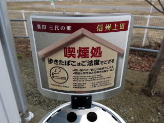 待合室から外れた位置にあった喫煙コーナー。歩きタバコは禁止である旨記された小さな看板が灰皿に設置してあります。喫煙所設置位置も含め、他の地方民鉄より進んでいるように見えますが、他社よりこの訪問の時代が進んでいるだけですので…。(H28.2撮影)