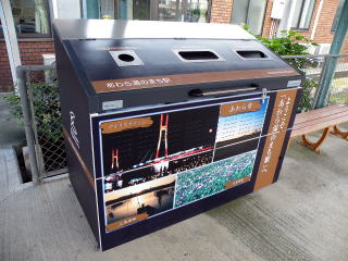 | 三国芦原線 あわら湯のまち駅 駅舎改修時に整備されたかなり大型のゴミ箱。正面は付近の名所の写真があります。あわら湯の町駅のものは、駅から少し遠いですが北潟湖や花菖蒲園など。何故か目の前の芦原温泉街はありません。(H24.6撮影) |