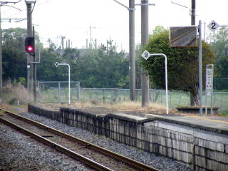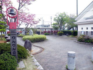 ホーム端には4段の「年輪」、嵩上げ痕があります。現在もあると思うのですがホーム端に近寄れなくなり、確認できませんでした。 | 駅舎に関係ないですが駅脇のあった「りんりん公園」。この鐘は現在もありますが、「どこが公園?」というくらい縮小されています。 | ||