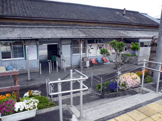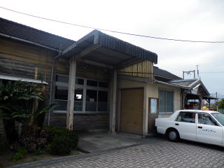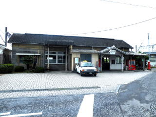 古い木造駅舎で、集札用の回廊がありました。若干大型で、駅事務室スペースが大きめでした。また下屋の増築もありました。(H23.4撮影) | 入口の車寄せ。駅名板は活字で明朝体のもの。屋根はトタンで鬼瓦風の装飾のみですが、何とはない味がありました。 | ||