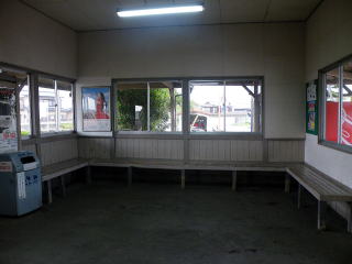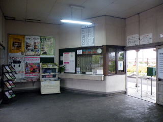 駅事務室側に小屋根がありました。荷物扱いの痕跡ではないでしょうか。 | 駅舎内。窓口は委託で営業していたようですが、訪問時は閉まっていました。 | ||