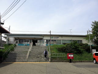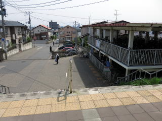 | 平屋のコンクリート造駅舎で、躯体は現在も使用されています。一番変わったのは駅舎前の大階段で、駅のバリアフリー化のため解体され、その際駅舎も改修されています。(H28.5撮影) | 駅舎から見た駅前。やや手狭でした。右手に2階建の大きな駐輪場がありますが、これが左手に移築され、駅前にロータリーが整備されました。 | ||