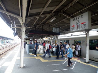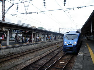 改札正面の1番ホームは折り返し特急列車が使用します。広く、カーブしたホームで、カーブのあまり途中で中線に合流する変わった配線でした。寝台列車の機回し用だったのかもしれません。 |