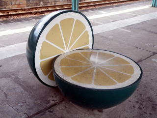 地平時代の4番ホームにあったベンチ。大分と言えばカボス。津久見駅のオレンジベンチと色違いのものですが、日豊本線ホームが高架化されたのち移設されたのかは不明です。 |