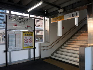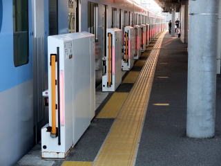 駅名標は橋上駅舎への階段前、ホームが広くなった箇所にありました。 | ホームドアは駅開業後の設置です。接触防止か、ドアの開いた状態では赤い警告灯が点灯します。 | ||||||||||||||||