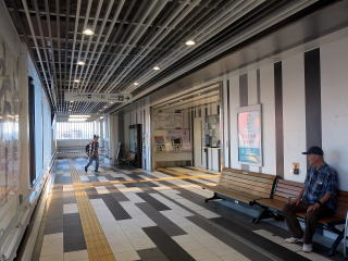 こちらは北口。衣装的には南口と同じです。こちら側には郊外型店舗がいくつか並びます。 | 駅舎内、自由通路。シンプルな外観に対し、モザイク様の床デザインが目を引きます。 | ||||||||||||||||