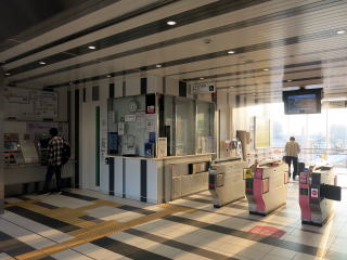 改札口。窓口も営業していますが早朝のため開いていませんでした。 | ホームは2面2線。柵のようなホームドアがあります。 | ||||||||||||||||
