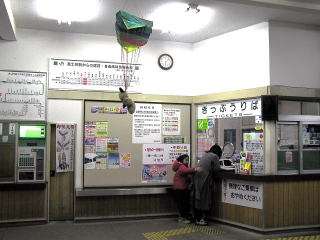 駅舎内の落下傘キツネ。随分以前からぶら下がっており、もはや名物でしょうか。この手前側に待合室があります。 | 改札脇に「アララギ之里」の看板があります。 | ||||||||||||||||