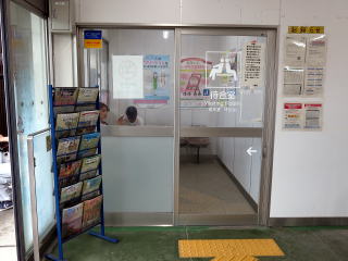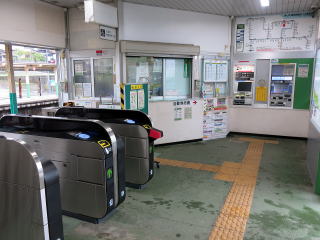 | 駅舎入口の階段。この奥に新設のエレベーターがあり、またこの手前側に2階建の駐輪場があり、そこから駅舎前に通じる通路もあります。 | 駅舎内。券売機が2機あり、窓口が営業しています。改札機があることもありかなり狭いです。 | ||||||||||||||||