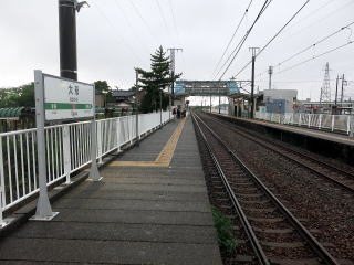 | コンクリートの板を継ぎ足したようなホームはこの路線の特徴でもあります。2面2線のホームです。 | 跨線橋から見た駅舎。駅舎の周囲は住宅地ですが、駅を俯瞰すると阿賀野川沿いの田園地帯です。 | ||||||||||||||||